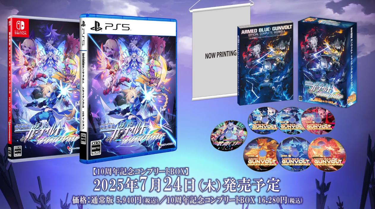 【《苍蓝雷霆GUNVOLT》三棱合极版将于7月24日发售】INTI CREATES宣布,《苍蓝雷霆GUNVOLT:三棱合极版》将于2025年7月24日发售,登录平台为PS5和NS。本作是收录了2D横向卷轴动作游戏《苍蓝雷霆GUNVOLT》(2014年)、《苍蓝雷霆GUNVOLT 2》(2016年)、《苍蓝雷霆GUNVOLT 3 锁环》(2022年)共3部作品与所有DLC的完全版。此外,此次还重新调整了动作性,并翻新语音与乐曲,搭载了能享受重新构筑的特典广播剧CD等相关内容的数据库模式等新要素。《苍蓝雷霆GUNVOLT》标准版285HKD,10周年纪念完全版BOX版778HKD,其中附带设计资料集、原声带CD、歌曲CD,以及特别绘制B2挂画。