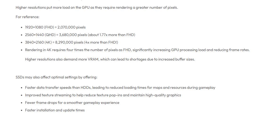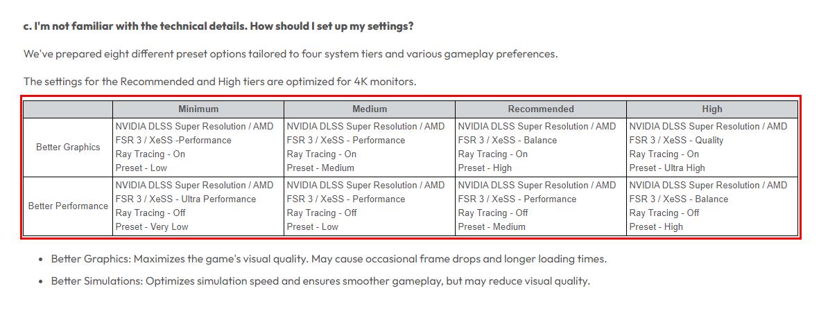 在设置上,官方表示更高的分辨率会给GPU带来更大负载,因为需要渲染更多的像素。并推荐使用SSD,进而减少掉帧和加载时间,以加强游戏体验。据透露,游戏提供了“画质优先”(4种)和“性能优先“(4种)共8种预设选项。其中前者注重游戏的视觉质量,但可能会掉帧或加载长;后者则主要确保流畅的游戏体验,具体如图2所示。