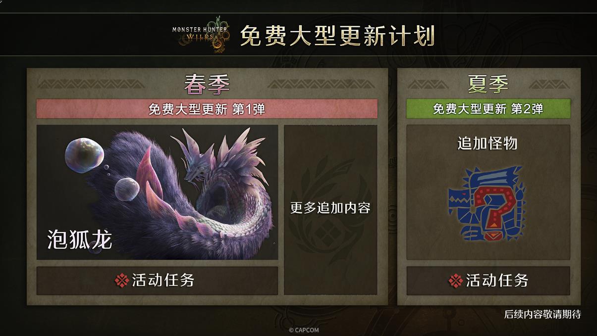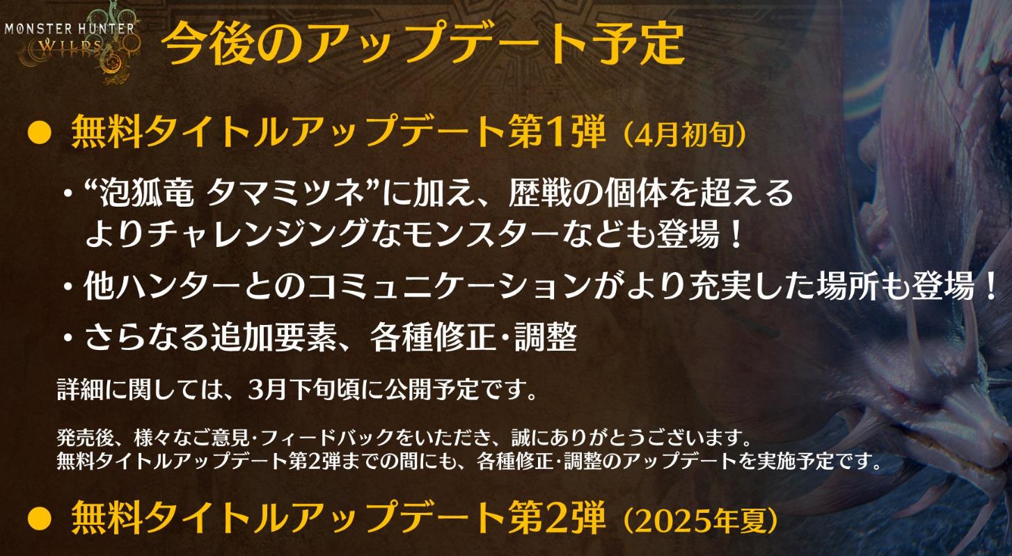 《怪物猎人:荒野》将于4月初迎来大型免费更新第一弹。届时会有“泡狐龙”和“比历战个体更具挑战的怪物”登场。此外,还有能和其他猎人更加充分交流的场所(集会所),以及追加要素、修复、调整等内容到来(详情会在3月下旬进一步公开)。免费第二弹大型更新预计2025年夏季推出。