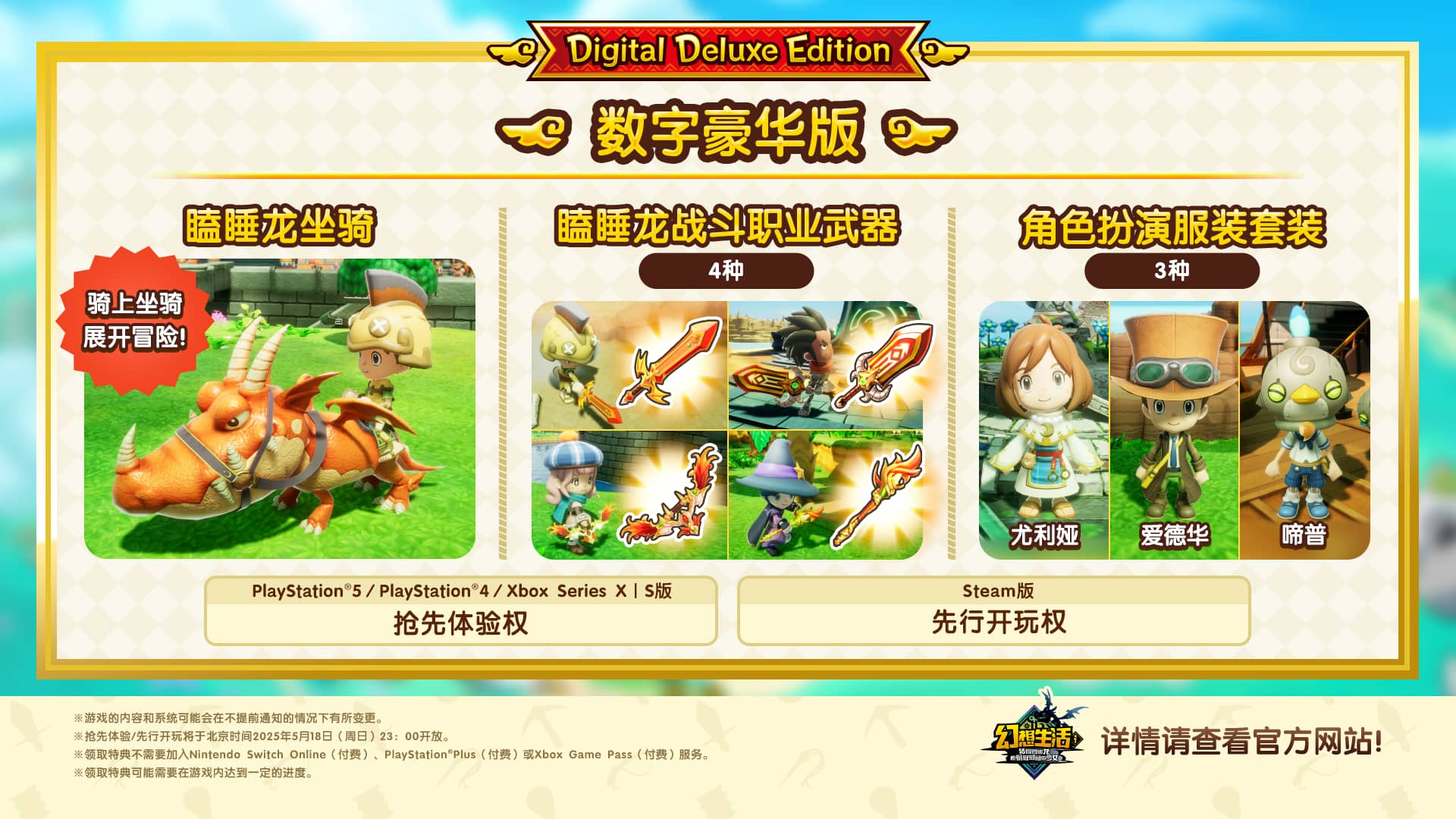 【L5生活RPG《幻想生活i》今日开启预约】《幻想生活i:转圈圈的龙和偷取时间的少女》已于今日开启预约,平台为PS4/PS5/Xbox Series/Steam(NS版暂未开放)。预购期间购买可获得“新手冒险家礼包”,其中附带提升经验值获取量的饰品“蝴蝶吊坠”及各类实用的消耗性道具。本作还提供豪华版可选,其中提供瞌睡龙坐骑、瞌睡龙战斗职业武器、角色扮演服装套装。《幻想生活i》是L5所打造的一款人人都能享受的慢生活RPG,本作将于5月21日晚23:00点解锁,豪华版可在5月18日23:00点抢先进入游戏。