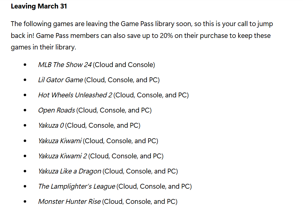 3月31日:《美国职业棒球大联盟24》 (云端/主机),《Lil Gator Game》 (云端/主机/PC),《风火轮爆发2 涡轮增压》 (云端/主机/PC),《Open Roads》 (云端/主机/PC),《人中之龙0》 (云端/主机/PC),《人中之龙:极》 (云端/主机/PC),《人中之龙:极2》 (云端/主机/PC),《人中之龙7》 (云端/主机/PC),《燃灯者联盟》 (云端/主机/PC),《怪物猎人:崛起》 (云端/主机/PC)