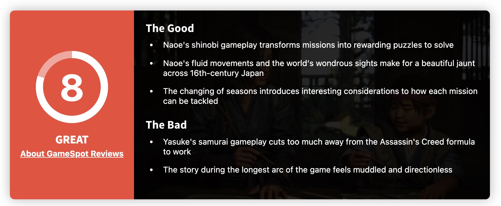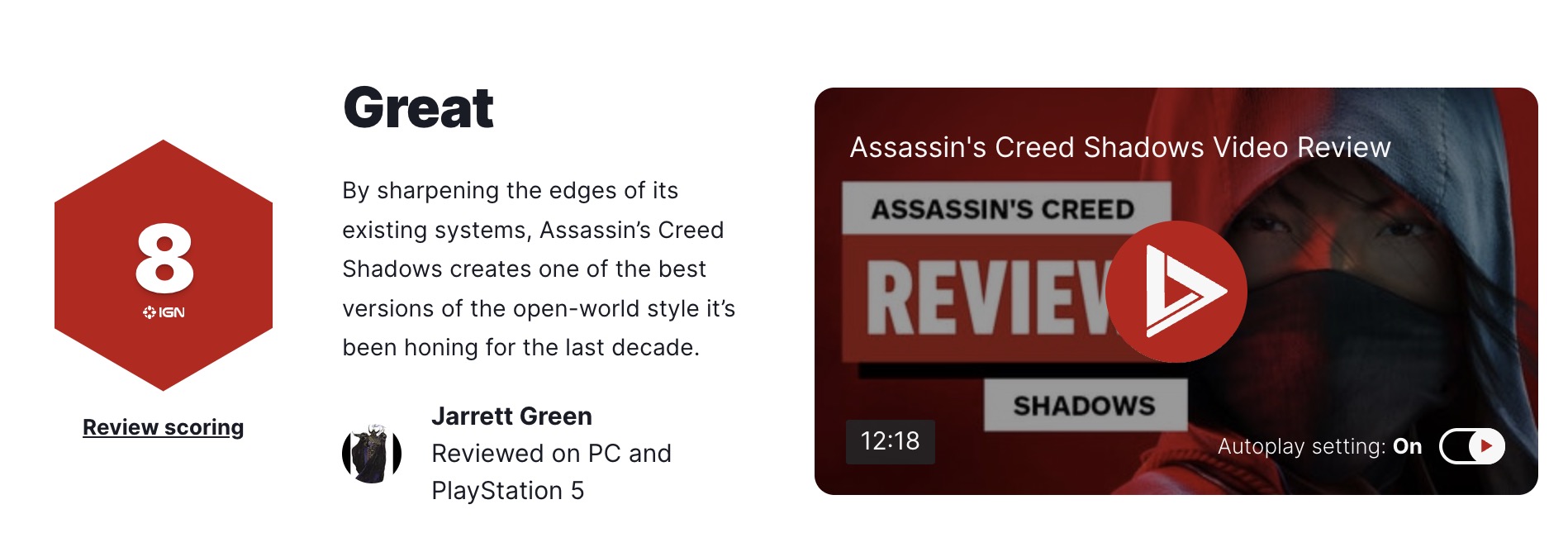 【《刺客信条:影》媒体评分出炉:MC均分82,获IGN/GS双8分评价】育碧最新的《刺客信条:影》全球媒体评分现已解禁。目前游戏在Metacritic上的PS5版均分为82分(暂收录73家媒体),Xbox版87分(由18家媒体给出),PC版78分(由41家媒体给出)。其中IGN和GameSpot两家均为本作打出8分的评价。