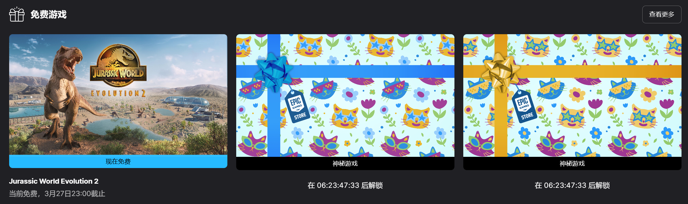 【Epic喜+1】策略模拟游戏《侏罗纪世界:进化2》现已可在Epic商店中免费领取,领取后永久入库,截止时间为3月27日23:00。下周将有2款神秘游戏即将开放免费领取。
