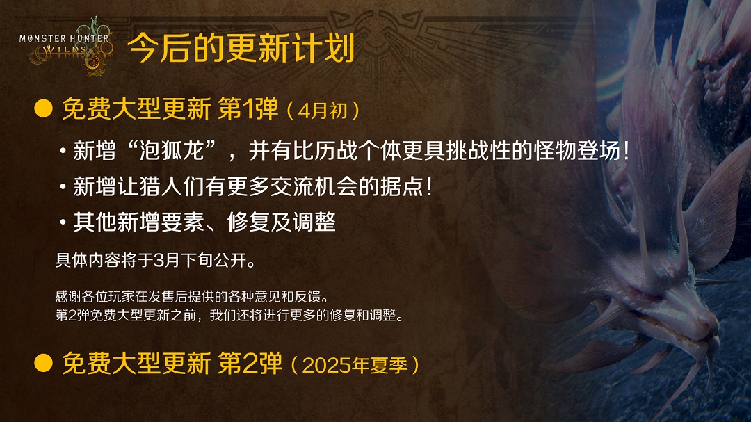根据之前官方所透露的信息,第一弹更新将新增“泡狐龙”,以及比历战个体更具挑战性的怪物。并追加让猎人们能有更多交流机会的据点。《怪物猎人:荒野》现已在PS5、Xbox Series、Steam上推出。