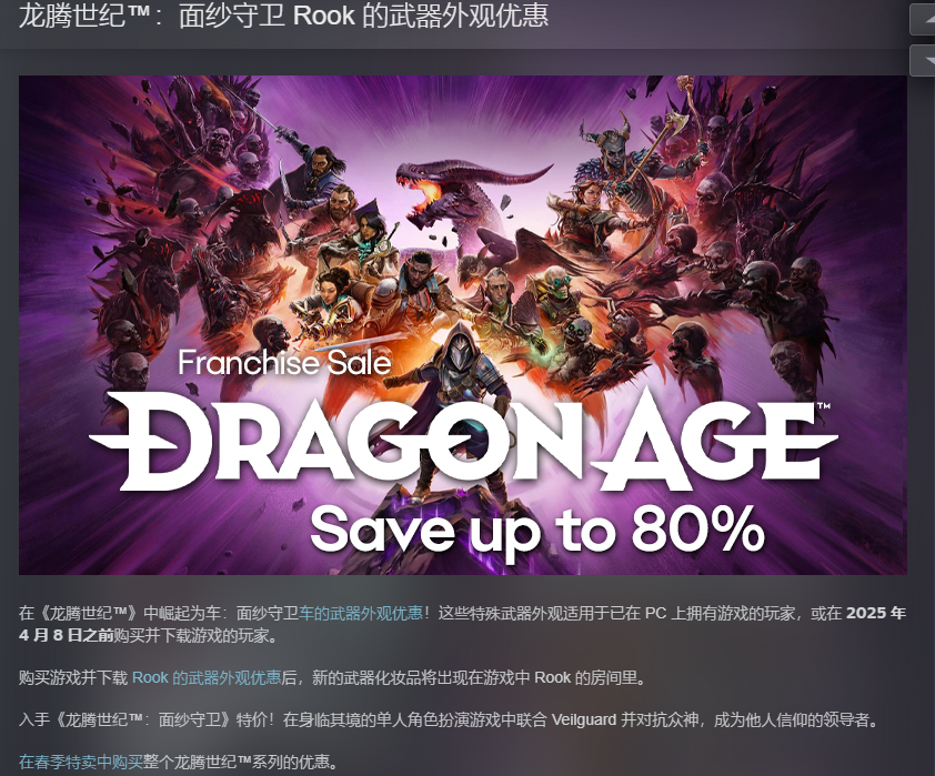 【《龙腾世纪:影障守护者》PC版更新免费武器包】BioWare为《龙腾世纪:影障守护者》PC版推出了免费武器外观包“Rooks套装”,Steam玩家在4月8日前购买游戏即可领取。该作当前正在以5折149元的价格促销中,目前主机版更新计划仍未明确。此前,EA披露该作销量低于预期,并将BioWare团队重心转向《质量效应》新作,裁撤部分开发人员。为挽回玩家,游戏已加入3月PS+游戏目录。
