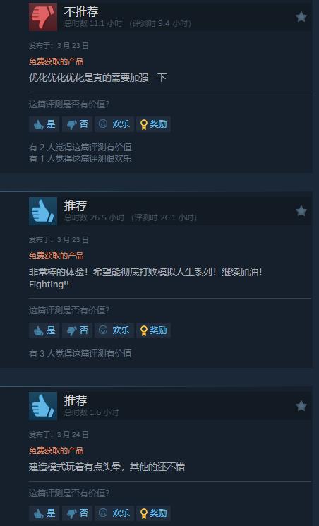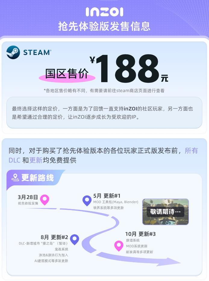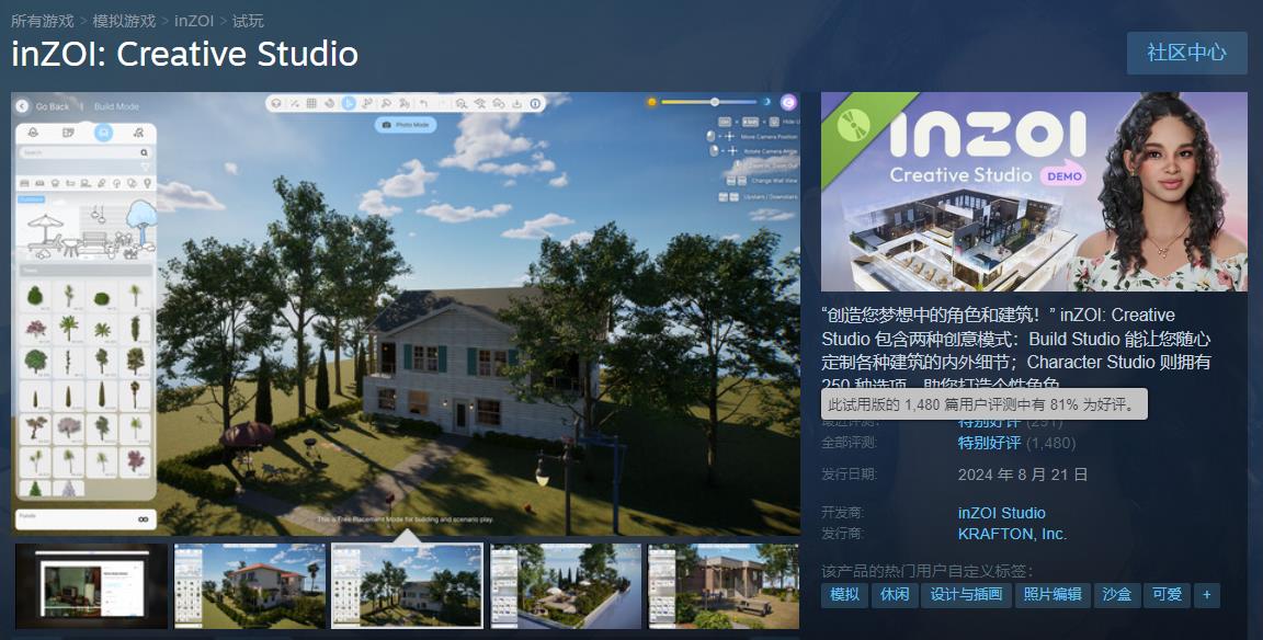【《inZOI》试玩版Steam上获玩家“特别好评”】由KRAFTON所带来的全新生活模拟游戏《inZOI(云族裔)》试玩版“Creative Studio”现已在Steam上面向所有人开放。玩家可免费下载,体验本作的Zoi自定义和建造功能。截至目前,《inZOI :Creative Studio》在该平台上已有1480篇评测,其中玩家好评率81%,整体为“特别好评”(国区156篇,好评率78%)。不少玩家表示后续内容值得期待,也有用户反馈称游戏优化有待进一步提高。《inZOI》将于3月28日在Steam上开启抢先体验,游戏售价188元,购买的玩家可在正式版前免费享受所有的DLC以及大型更新。