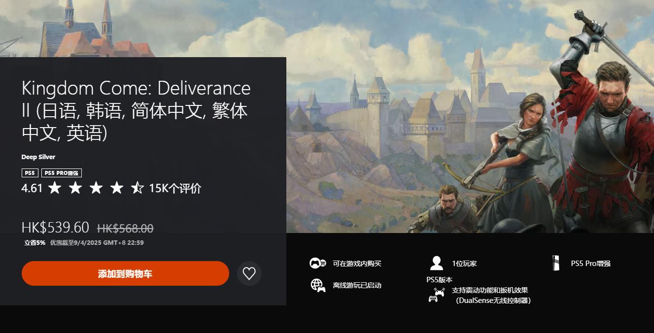 《天国拯救2》539.6HKD(95折/首次优惠)