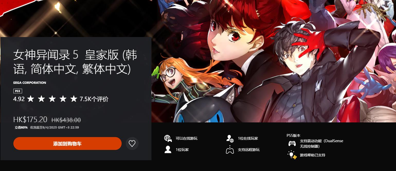 【PS商店“春季优惠”今日开启:《女神异闻录5:皇家版》新史低】PS HK商店今日正式开启了“春季优惠”活动(面向所有用户),不少游戏正在促销中,热门作品包括: