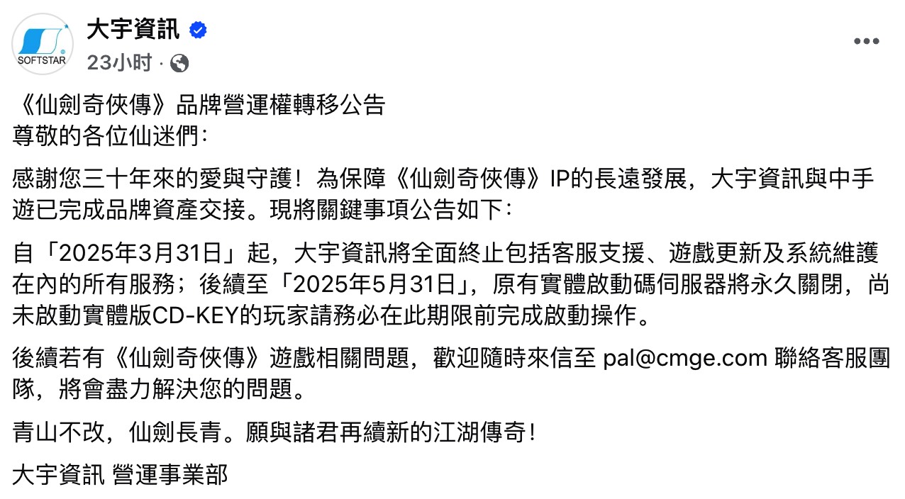 【大宇已完成《仙剑奇侠传》IP资产交接】大宇资讯已在社交媒体上发文,宣布已经与中手游完成《仙剑奇侠传》的IP资产交接。从3月31日起,包括客服支持、游戏更新及系统维护在内的所有服务将全面终止。2025年5月31日后,原有实体激活码服务器将永久关闭,尚未激活实体版CD-KEY的玩家请务必在此期限前完成激活操作。此前大宇已将《轩辕剑》IP出售给欢动(香港)科技有限公司,这也代表着这两大经典IP已与大宇无关。