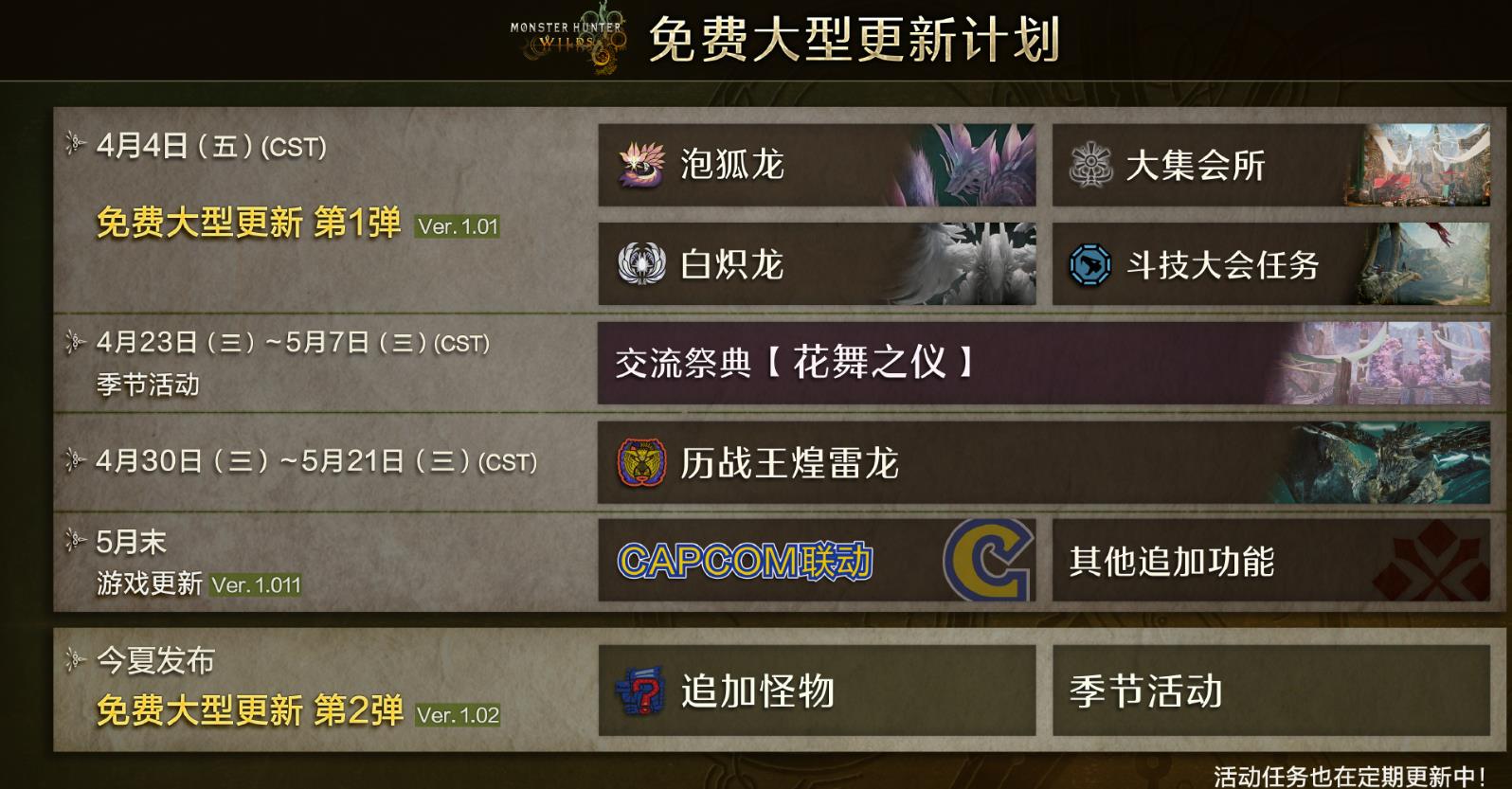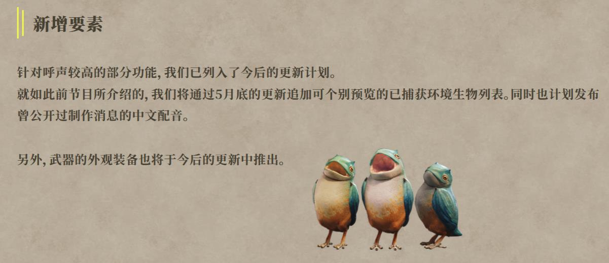 【《怪物猎人:荒野》中文配音5月底到来】Capcom官网近日发布了《怪物猎人:荒野》总监德田优也发布的《致玩家信》,介绍了今后的更新与调整计划。其中该内容的中文版中特别提到了大家关心的中文配音预计将通过5月底的更新追加发布。