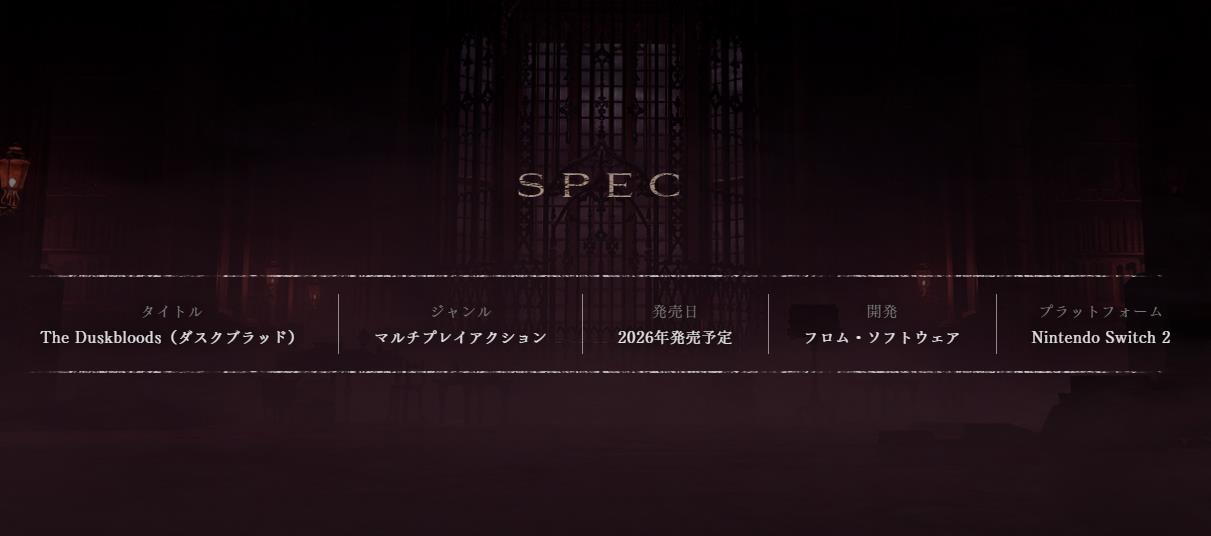 【《The Duskbloods》是一款最多支持8人的PvPvE游戏】From Software新作《The Duskbloods》官网现已上线。根据页面信息显示,本作是一款最多支持8人游玩的PvPvE游戏。玩家将作为“黄昏的血族”(通过特别的血之力而获得超越人类力量的人)围绕“起始之血”展开战斗。有关本作的概念和世界观等信息,制作人宫崎英高会在4月4日晚上21:00的采访“创作者之声”中公开。《The Duskbloods》将于2026年在NS2平台上推出。