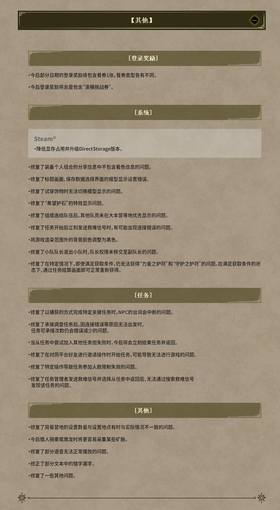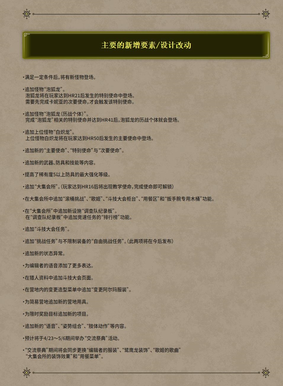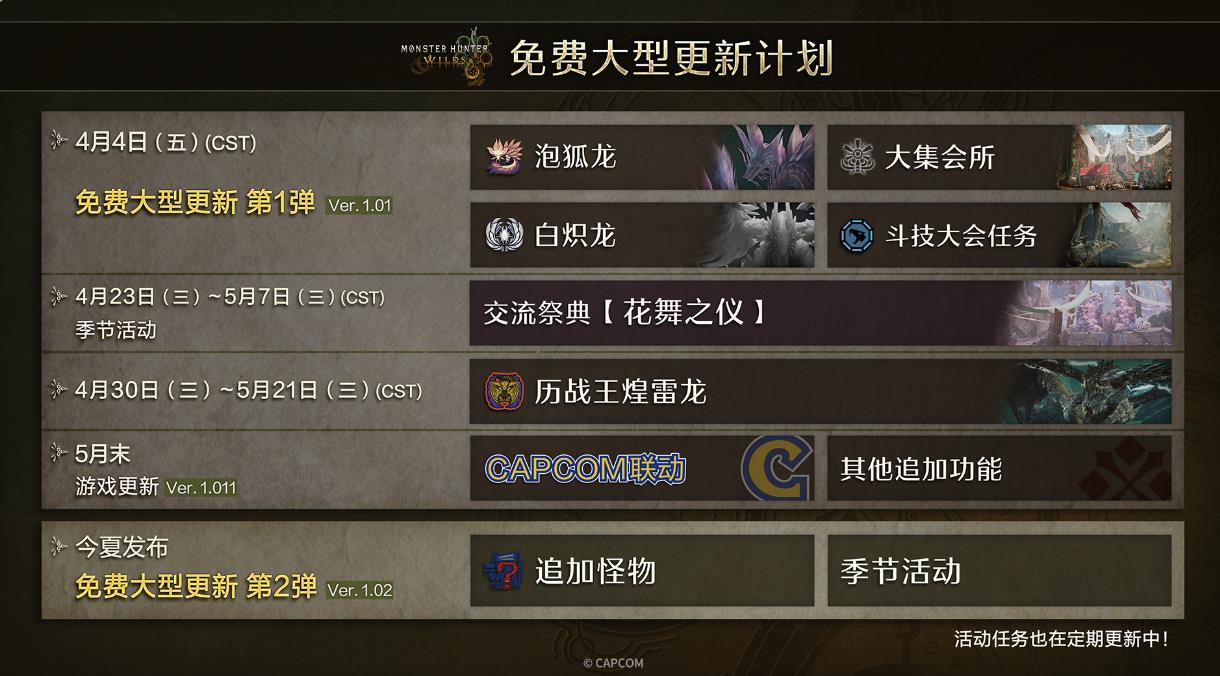 【《怪物猎人:荒野》第一弹更新将于明天上午11点上线】《怪物猎人:荒野》官媒发布了游戏免费更新第一弹内容的概要。此次更新会带来泡狐龙、大集会所、斗技大会任务、白炽龙任务等内容,预计会在4月4日北京时间上午11点推送。需要注意,使用线上功能需要升级至最新版本。该更新PS5版大小约10 GB,Xbox 版约6 GB,Steam版约6 GB(使用高清纹理包10 GB)。详细说明可参考附图。