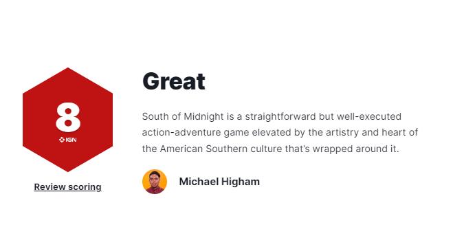 IGN:《午夜之南》是一款优秀的动作冒险作品。12小时的体验中,无任何拖沓之感。虽玩法本身并不突出,但游戏独特的艺术风格、优秀的叙事及令人印象深刻的角色使其值得被推荐。