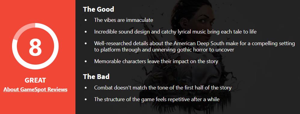 GS:游戏拥有着引人入胜的故事、出色的氛围塑造、充满魅力的角色、优秀的视听效果。但战斗系统略显平庸,一些重复性的结构设计会给人带来单调乏味的感觉。