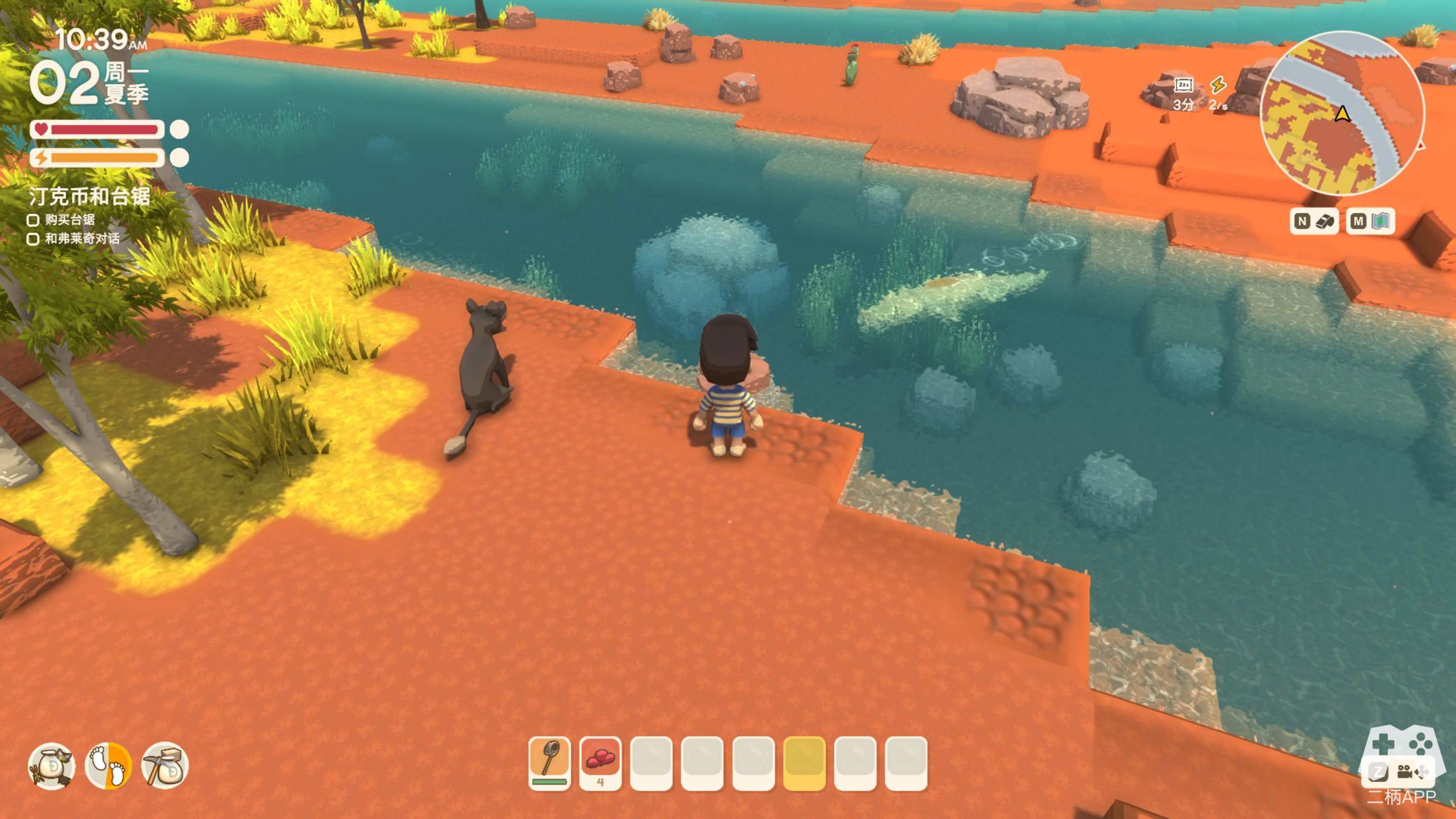 玩家所处的小岛生态环境多种多样,这里有低洼湿地,也有岸边浅滩,有长满仙人掌的荒草地,也有成片绿茵的茂密丛林,每一种生态环境都有其专属的动植物,这些都在玩家探索岛屿时提供了不少的新鲜感。游戏的沙盒属性较为突出,玩家在制作铲子后可以用其改变小岛地形,打造出各种想要的地势。