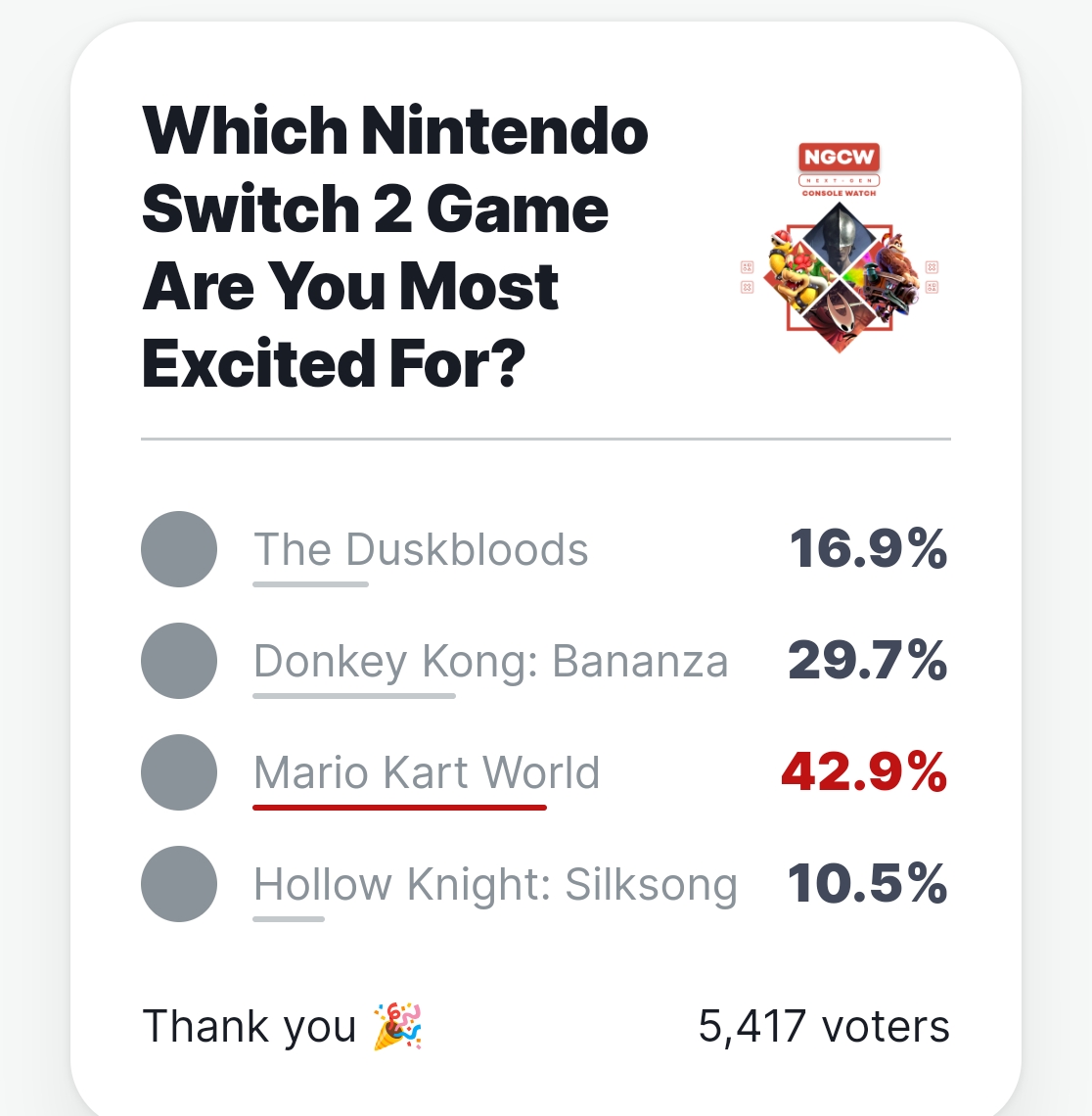 【投票显示超四成玩家最期待《马里奥赛车 世界》】伴随Switch2相关消息的陆续发布,其护航阵容也开始与玩家见面。近日,外媒IGN发布投票:你最期待ns2上哪款游戏?截止发文时,共有5417名玩家参与。其中16.9%的玩家选择《the duskbloods》;29.7%的玩家选择了《咚奇刚 bananza》;42.9%的玩家选择了《马里奥赛车 世界》;10.5%的玩家选择了《空洞骑士 丝之歌》。各位心目中最期待的Switch 2游戏是什么呢?