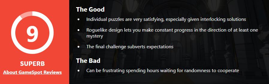 GameSpot(9分):本作是一款优秀的Roguelike解谜游戏,其谜题设计的十分精巧。虽然一些随机内容会令人沮丧,但整体给人带来了一段极为难忘的游戏体验。