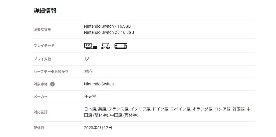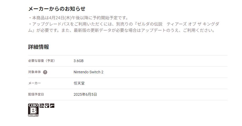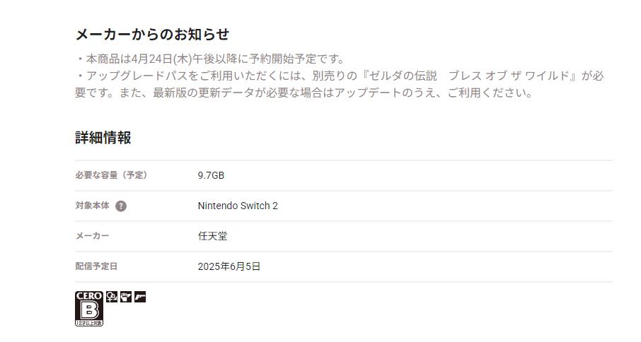 【NS2版《塞尔达传说》升级包大小揭晓】根据任天堂商店页面显示,NS2版《塞尔达传说:旷野之息》升级包大小为9.7GB,游戏所需空间14.4GB;《王国之泪》的大小为3.6GB,游戏所需空间16.3GB。这两款作品的NS2版会和新机一同在6月5日上市。NS2版除提高分辨率和帧数外,还带来了加载时间缩短、存档数增加以及APP联动等内容。NS2版可单独购买,也可使用原版通过1000日元或NSO拓展包会员升级。