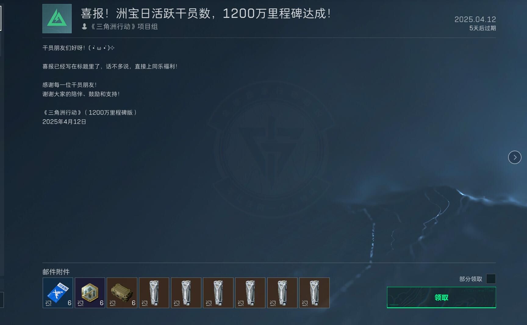 【《三角洲行动》日活玩家数突破1200万】近日,腾讯旗下FPS游戏《三角洲行动》官方宣布:其日活玩家已突破1200万人次。此次公告以游戏内邮件形式进行通知,并且所有玩家都可在邮件内领取官方准备的礼物:6张战备物流券、6张装备经验卡、6个随机物资箱、6个饰品曼德尔砖。本作即将在4月17日开启全新赛季。