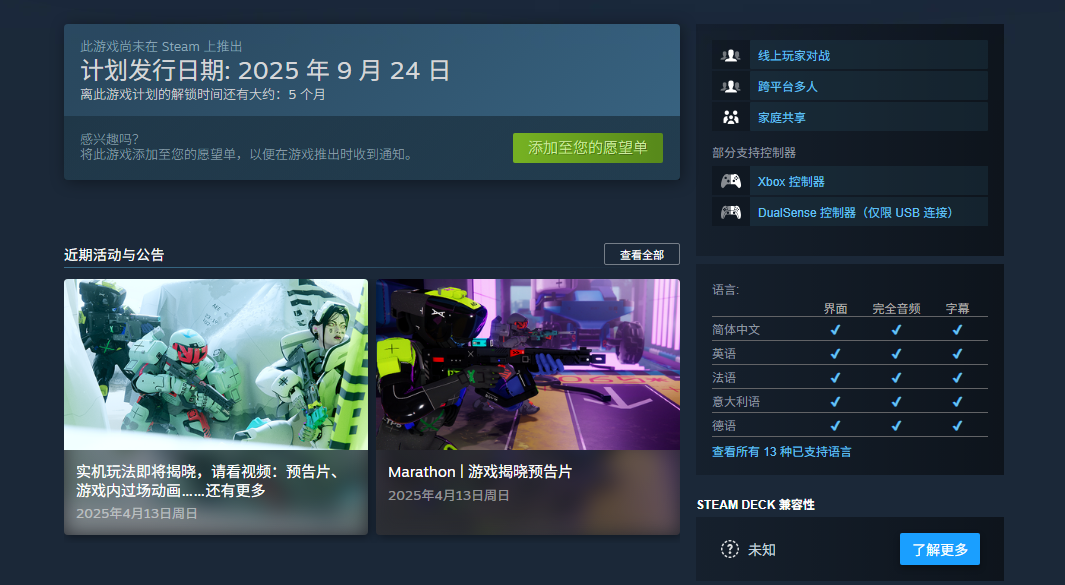 【《失落星船:马拉松》支持中文语音和字幕,商店页面已上线】近日,Bungie宣布,旗下最新FPS游戏《失落星船:马拉松》将于今年9月24日登陆 PS5、Xbox Series X|S 与 PC 平台。目前本作商店页面已经正式上线,玩家可将其添加到心愿单,根据Steam页面显示,本作将支持中文语音和字幕。《失落星船:马拉松》为团队第一人称撤离射击游戏,玩家将选择疾行者并三人组队,与敌方疾行者队伍及安全部队争夺武器和升级,所获得的战利品都可收为己有,并借此机会不断试验、重新配装,然后强势回归。