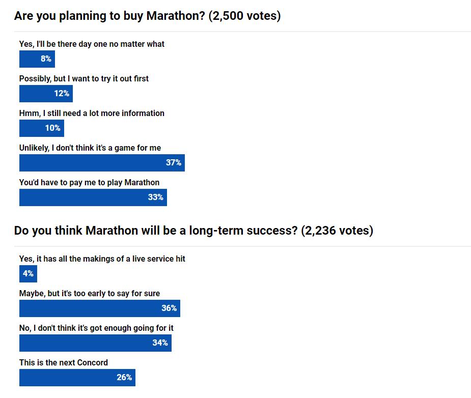 【外媒调查显示玩家对《失落星船:马拉松》兴致缺缺】Bungie在周末的活动中对新作《失落星船:马拉松》进行了详细的介绍。随后海外游戏媒体PushSquare针对本作的玩家满意度举行了投票活动。在目前已有的2000多票中,大多数玩家对这款游戏的兴致不高。需要注意,此调查仅供参考,PushSquare的用户整体倾向于大型单机游戏,故可能无法代表所有玩家。