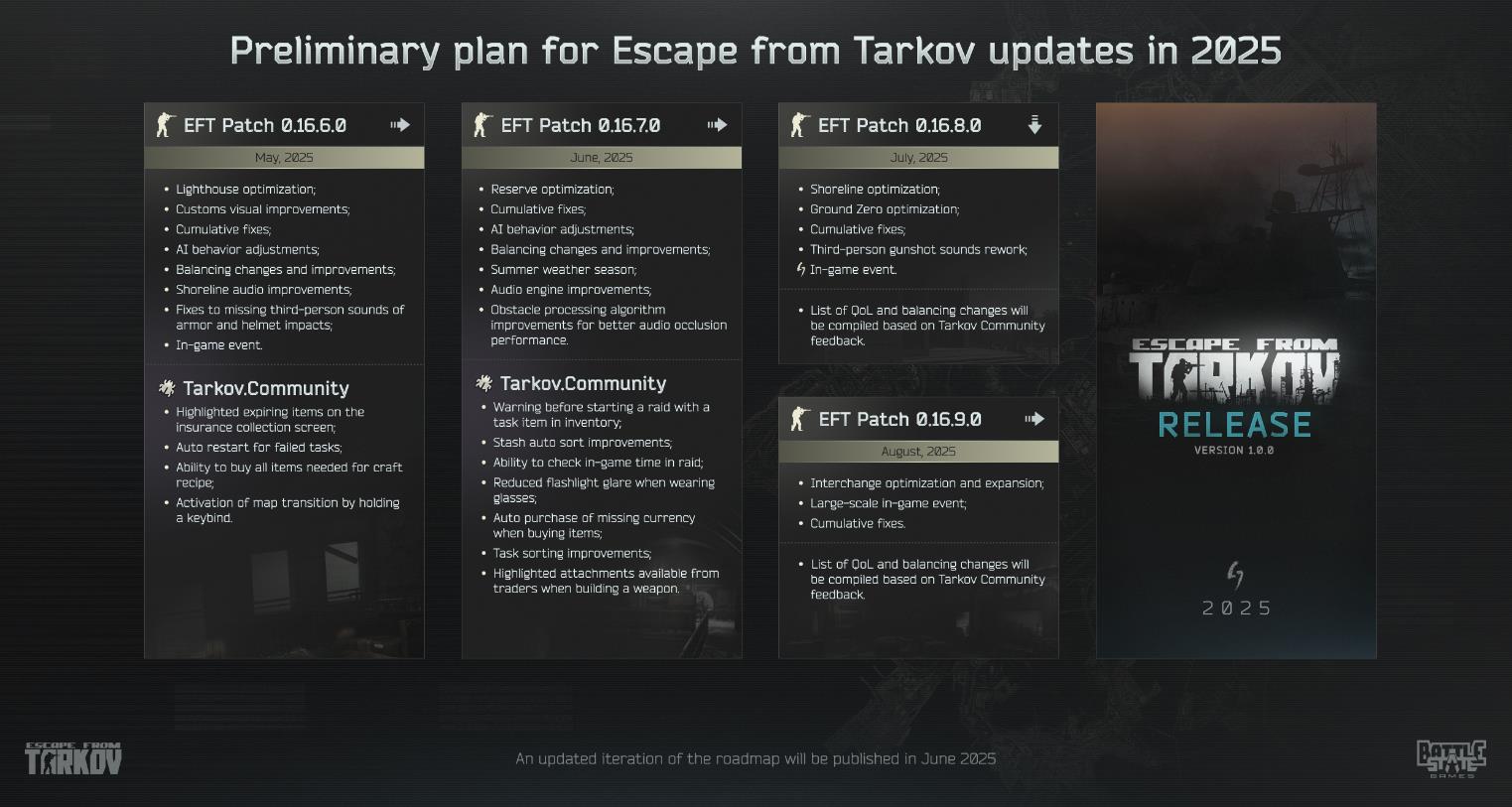 【《逃离塔科夫》将于2025年内推出1.0正式版】根据Battlestate Games公布的《逃离塔科夫》最新规划路线图显示,这款经典“搜打撤”游戏将在2025年内推出1.0正式版。本作于2017年开始测试(2016年Alpha测试),至今已有近8年的时间。在正式版到来之前,开发团队计划在接下来的每个月都进行一次重大更新,其中在游戏质量改善方面纳入了大量的社区反馈。下次更新路线图预计在6月,届时可能会有正式版的具体发布时间。