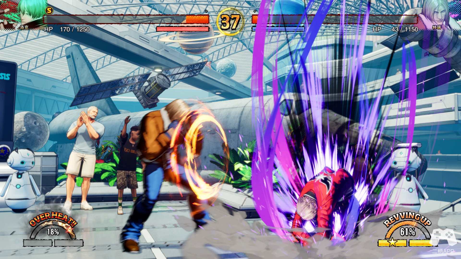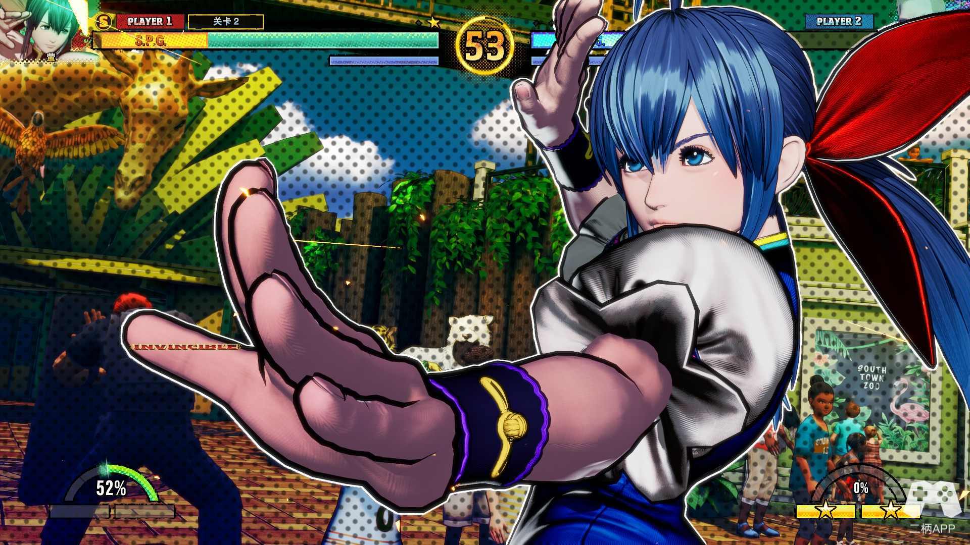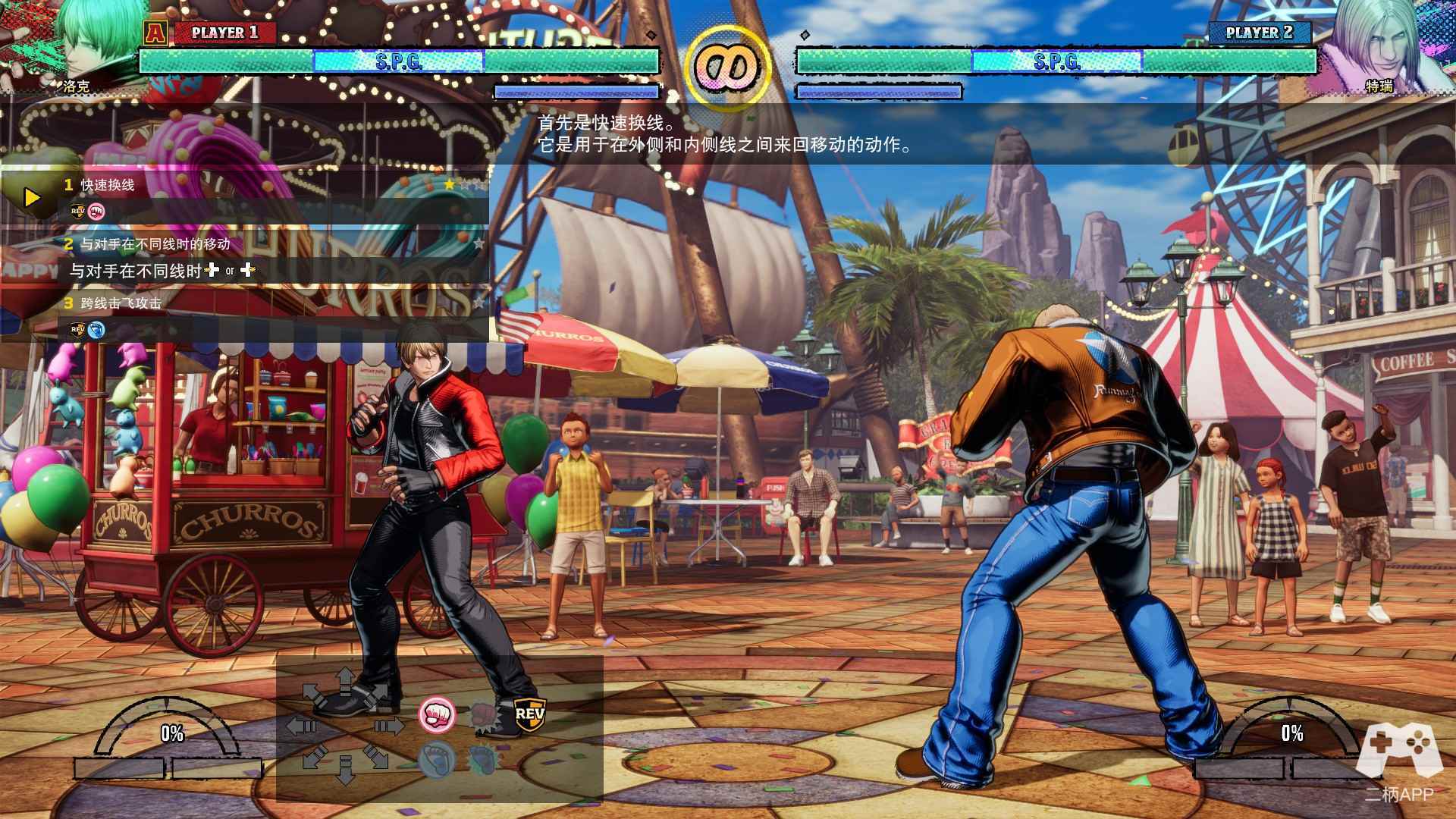 这一设计与《街头霸王6》的斗气系统有异曲同工之妙,但通过从T.O.P.进化而来的S.P.G.模式,SNK玩出了自己的特色:进一步将战术选择与血量管理挂钩——S.P.G.可被自由设置在你血量条的起始、中间或末端,当你的血量处于S.P.G.区间时,你可以获取更高的伤害与REV打击。从另外一个角度看,对手也可通过进攻迫使你结束S.P.G.带来的增益,越早开启S.P.G.又意味着战线拉长后会陷入更深刻的不利局面。因此,玩家需在“高风险高回报”的S.P.G.激活时机上作出抉择。
