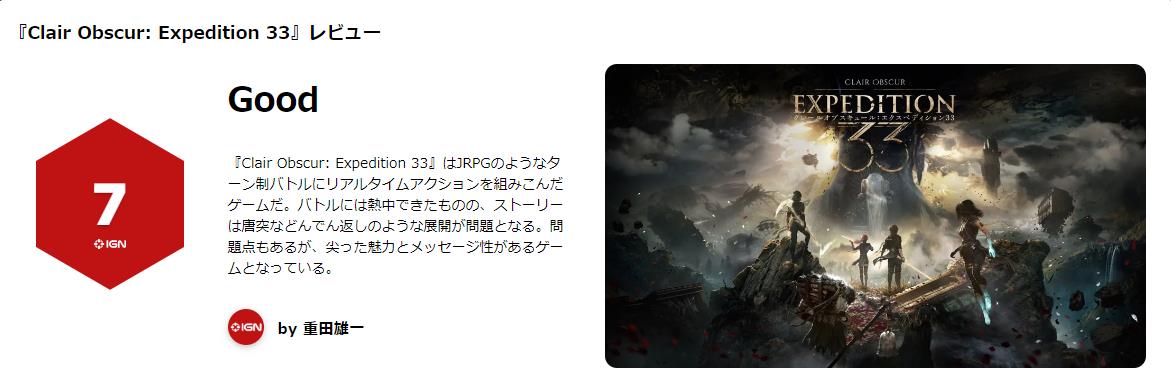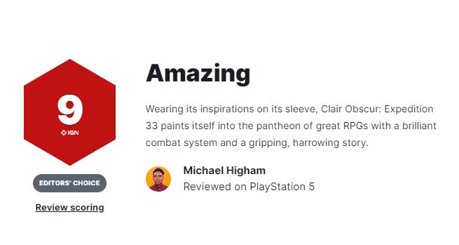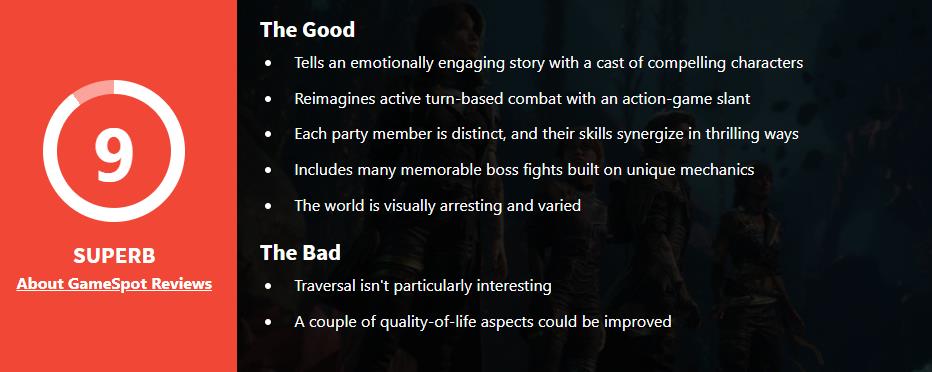 IGN:作为Sandfall的处女作,他们融合了经典和现代JRPG的精髓,并将其打造成了一款拥有自己特色的作品。华丽的战斗和有些伤感的叙事给人一种既熟悉又耳目一新的感觉。虽说后期剧情略显仓促,但整体节奏紧凑。不过探索方面有点简单。总的来说算得上是一款现代RPG中的杰出之作。