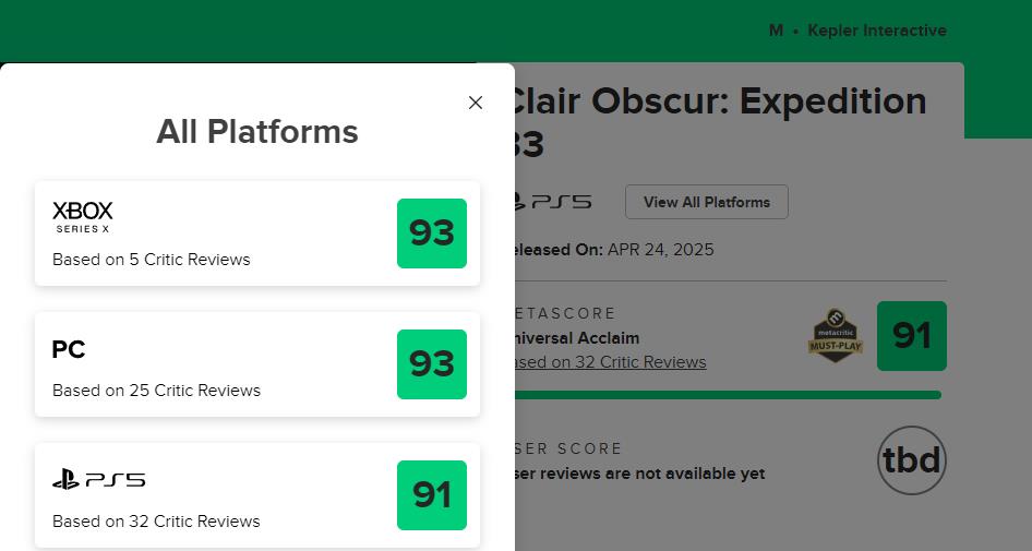 【《光与影:33号远征队》MC媒体均分93】由法国游戏工作室Sandfall Interactive所带来的回合制RPG《光与影:33号远征队》全球媒体评测现已解禁。截至目前,本作在MC上的PS5版媒体均分91(暂由32家给出),PC版93分(暂由25家媒体给出),Xbox版93分(暂由5家媒体给出)。其中IGN本部和GameSpot给出9分评价,IGN日本则打出7分。
