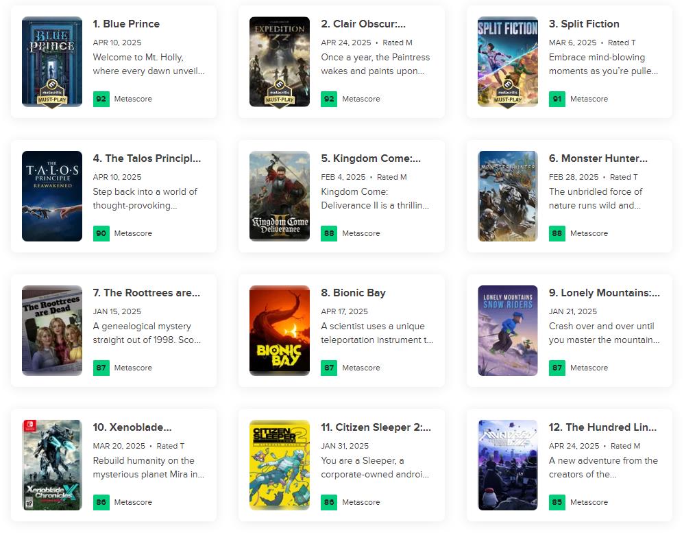 【《光与影:33号远征队》暂列MC 2025年度最高分游戏】由法国工作室Sandfall Interactive所打造的RPG《光与影:33号远征队》评测已于昨日解禁。截至目前,本作在MC上的媒体均分92。该成绩使其与独立游戏《蓝途王子》并列,成为2025年现阶段最高分游戏。前十名单如下: