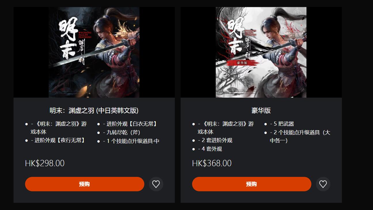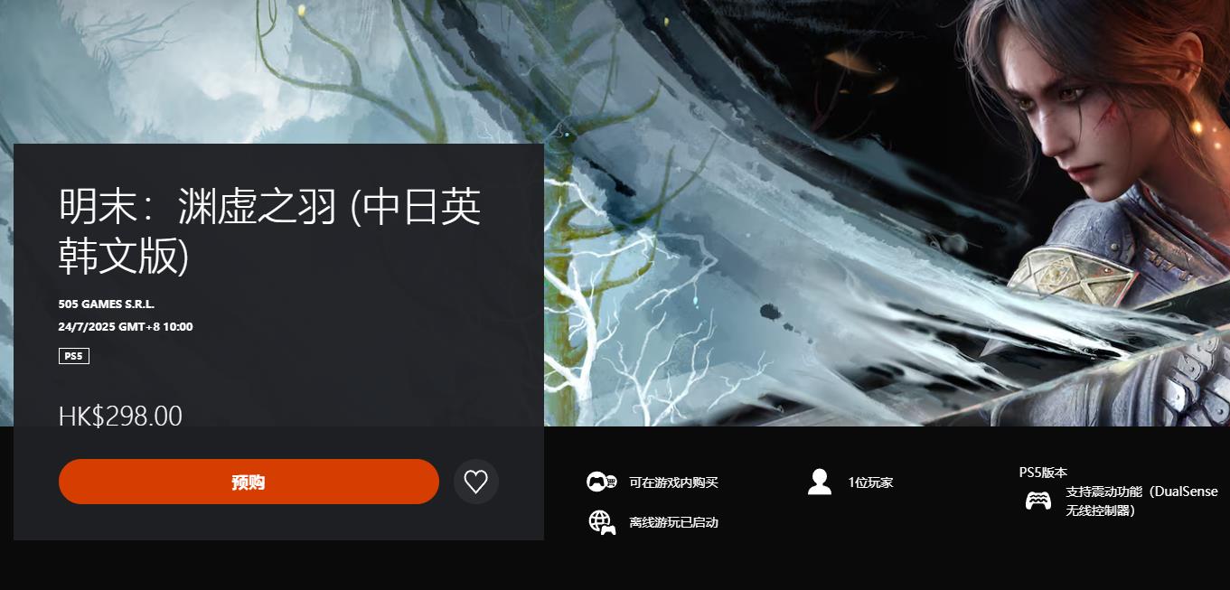 【PS5《明末:渊虚之羽》标准版售价298HKD】国风类魂动作角色扮演游戏《明末:渊虚之羽》已于今日在各大平台上开启预约。在PS HK商店中,本作标准版售价298HKD,预约特典为“黑白无常套装包”;豪华版368HKD,额外附带外观套装和武器等内容。根据页面信息显示,游戏支持PS5震动功能(DualSense无线控制器),目前暂未有Pro增强标注。《明末:渊虚之羽》将于7月24日登录PS5/Xbox Series/Steam/Epic,首发Game Pass。