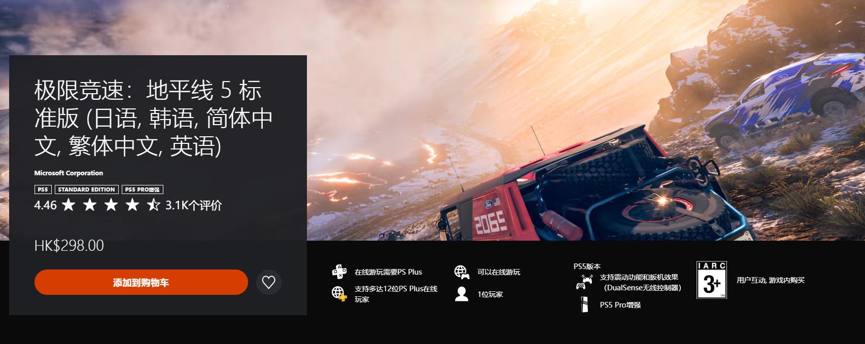 【PS5版《极限竞速:地平线5》今日发售,PSN玩家评价四星半】开放世界赛车游戏《极限竞速:地平线5》今日正式登录PS5平台上。截至目前,本作在PlayStation商店中已收获3152个评价,全球玩家评分4.46(四星半),其中五星好评率为83%。《极限竞速:地平线5》PS5标准版售价298HKD,游戏支持PS5 Pro增强以及中文。