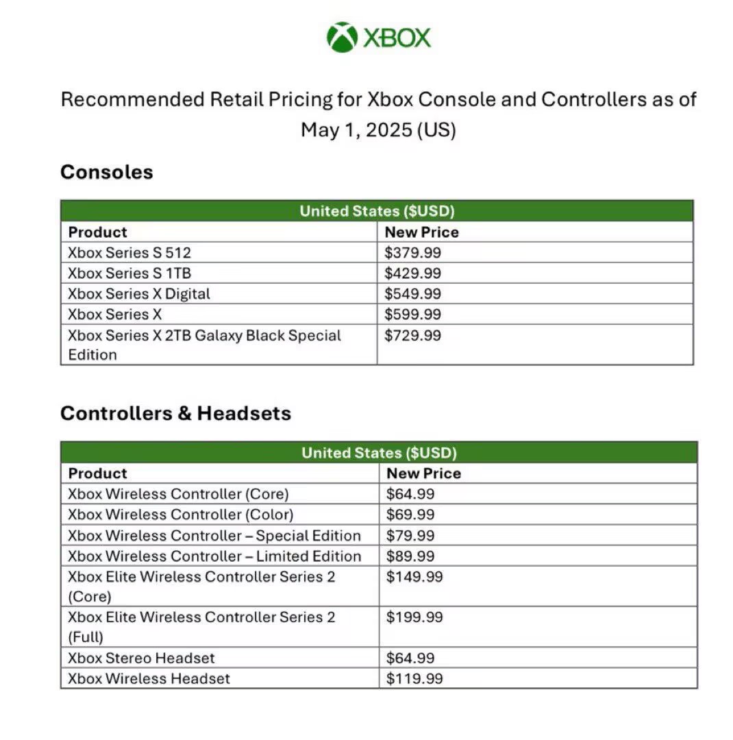 【Xbox主机全线提价,年底Xbox第一方游戏涨价至80刀】Xbox官方宣布,即刻(5月1日)起上调全部Series主机及手柄,耳机等周边硬件的价格,并将在年末假期期间将部分第一方新作的零售价上调至79.99美元。耳机外设的涨价仅限于美国和加拿大地区,其余硬件及软件的涨价是全球性的。以下为具体产品的美元区新定价信息: