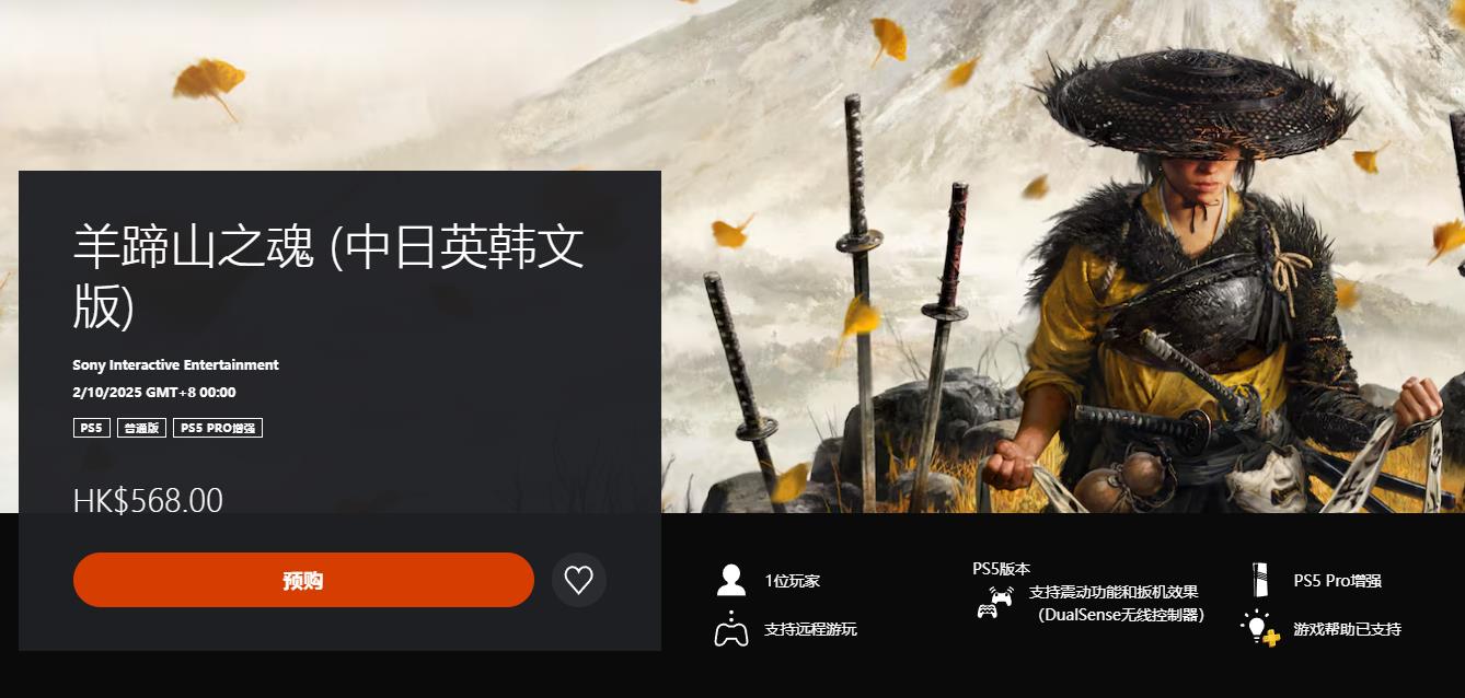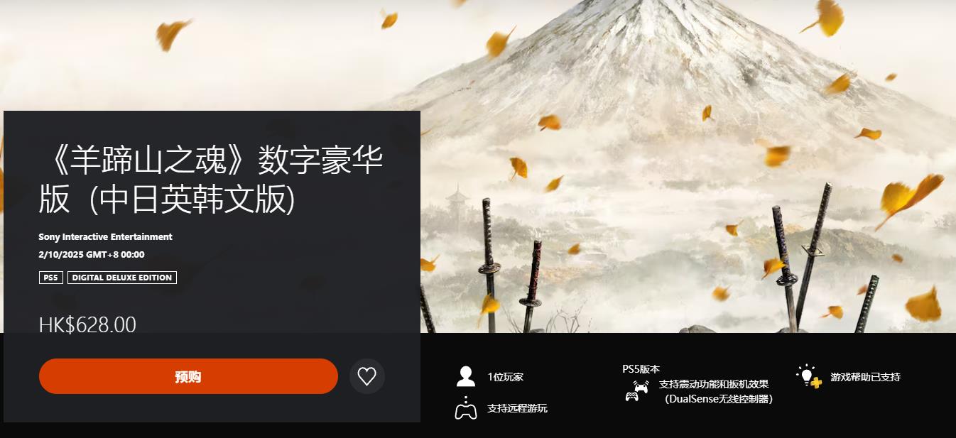 【《对马之魂》续作《羊蹄山之魂》现已在PS商店开启预购】由Sucker Punch Productions所带来的开放世界动作冒险游戏《羊蹄山之魂》现已开启预约。在PS HK商店中,本作普通版售价568HKD,预购可获得PSN头像和游戏内面具;豪华版628HKD,额外附带蛇之铠甲、铠甲染料、马匹和马鞍、刀具、旅者地图(抢先解锁)、护身符等特典。此次游戏的故事发生在前作《对马之魂》的300年后,玩家将化身为武者“笃”,踏遍虾夷山川,追索仇寇六人。并在此过程中,邂逅奇缘,缔结羁绊,寻得救赎,重塑归途。《羊蹄山之魂》将于北京时间10月2日零点在PS5上推出。
