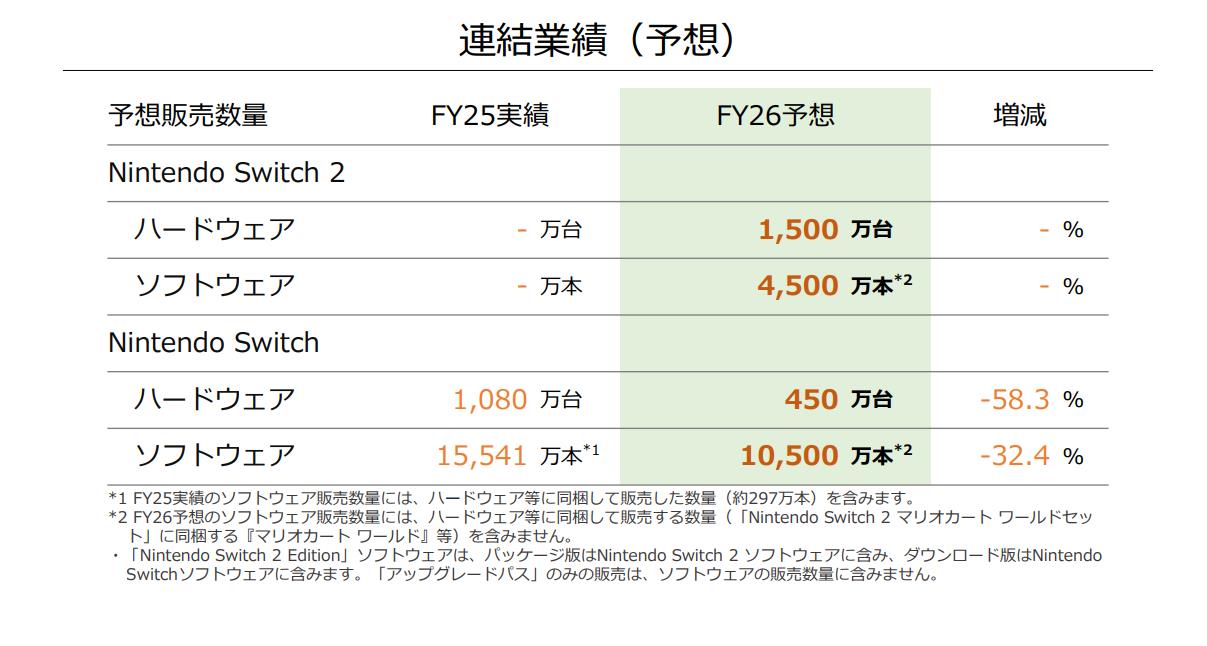 【任天堂预测NS2明年3月底前销量达1500万台】任天堂今日发布了最新一期的财报。根据内容显示,任天堂对NS2在26财年(截至2026年3月31日)的预估销量为1500万台,软件4500万份(其中不包含同捆版中的《马车世界》)。NS方面上,任天堂的预估销量为450万台(同比减少58.3%),软件10500万份(同比减少32.4%)。NS2将于6月5日正式发售,相关游戏阵容详见附图。