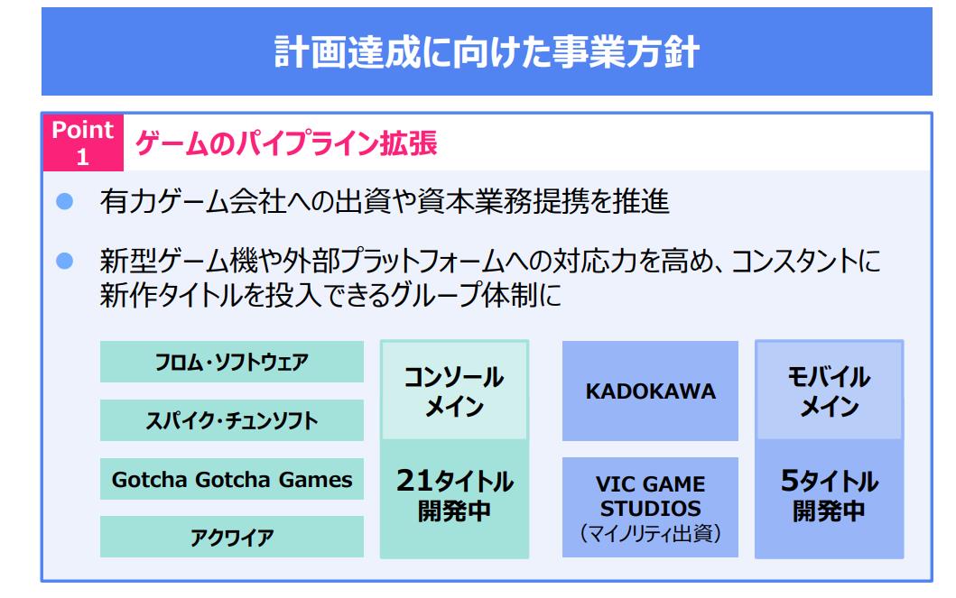 【角川旗下工作室目前有21款主机游戏开发中】角川在最新一期财报文件中透露,公司计划在游戏阵容方面上进行持续的扩张。据悉,旗下From Software、Spike Chunsoft、ACQUIRE、Gotcha Gotcha Games等主力工作室,目前已知有21款主机游戏正在开发中。其中From Software的新作《艾尔登法环:黑夜君临》即将在本月末上市,为NS2所打造的《黄昏血族(The Duskbloods)》预计会在明年推出。此外,角川在去年还和索尼签署了战略合作契约,两家未来会进一步地加强合作,旨在于全球范围内将旗下所拥有的IP价值最大化。