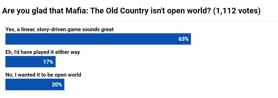【媒体调查显示多数玩家支持《四海兄弟:故乡》不采用开放世界设计】《四海兄弟:故乡》已确认采用线性叙事而非开放世界设计。这样的做法似乎也获得了大多数玩家的认可。海外游戏媒体Push Square近期发起了一项相关投票,截至目前共有1112名玩家参与。其中63%表示非常喜欢线性叙事模式;仅20%希望游戏采用开放世界设计;另有17%表示无所谓。不知大家的选择是什么呢?