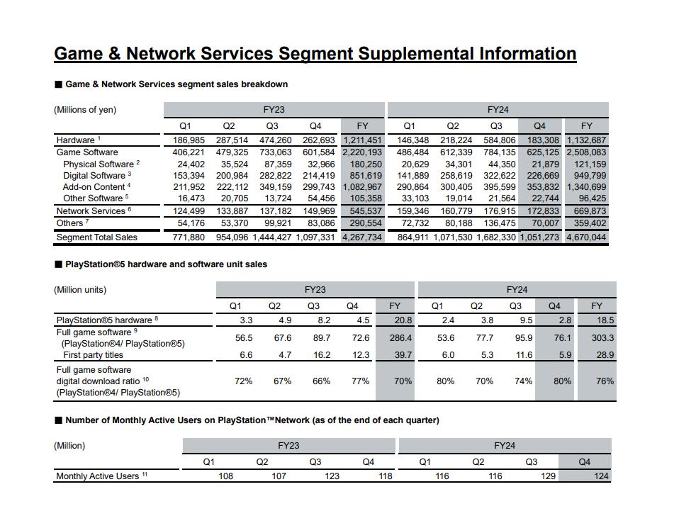 【PS5全球累计出货量达7780万】索尼在最新一期财报中透露,截至2025年3月31日,PS5全球累计出货量达7780万台(去年此时公布的数据为5930万)。公司在游戏业务上的一些其他数据如下: