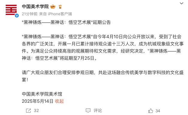 【《黑神话:悟空》艺术展开放时间延至7月25日】中国美术学院官博今日宣布,“黑神铸炼——黑神话:悟空艺术展”开放时间延长到7月25日。公告中指出:“该展览自今年4月10日向公众开放以来,受到了社会各界的广泛关注,开展一月已累计接待观众逾十三万人次,成为杭城现象级文化事件。为满足公众持续高涨的观展期待和文化需求,经研究决定,黑神话:悟空艺术展将延期至7月25日。”