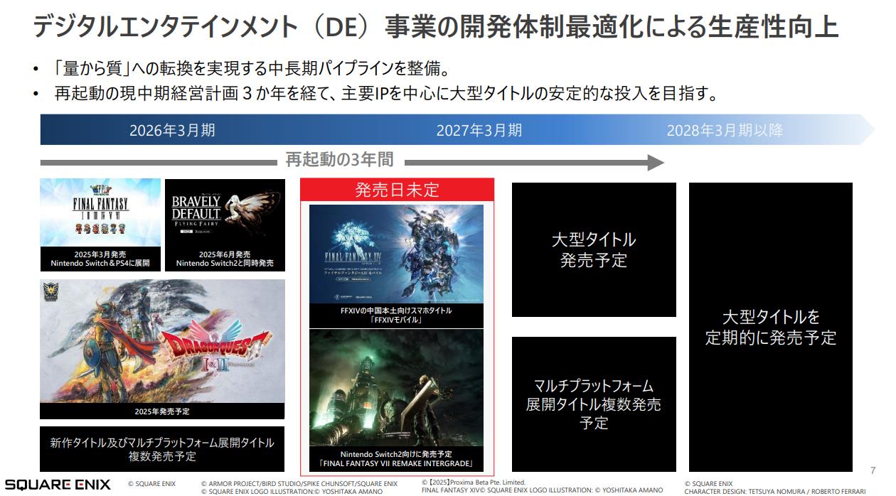 【SE今年仍有多款尚未公布的作品将要推出】SE今日发表了中期经营计划文件,其中对2025年4月~2027年3月末及以后的游戏阵容规划进行了介绍。报告中,SE再次强调了此前结构调整时所提出的“从量到质的转变”以及“多平台”策略。并表示中期三年(再启动)计划将以其主要IP为核心,稳定地推出大型项目作品。