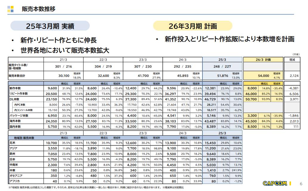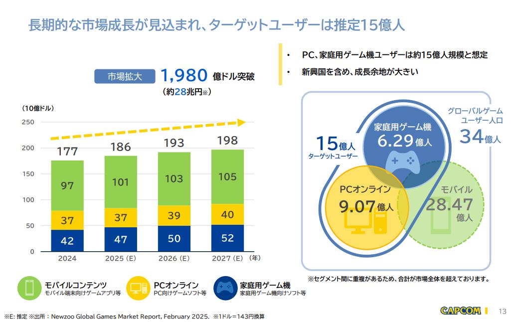 Capcom上一财年旗下数字版游戏中,PC/主机占比分别为54.4%和35.7%。算上实体版的9.9%(基本为主机),即公司PC/主机游戏比约为54:46。根据Newzoo的估算显示,目前每年的PC /主机玩家消费力都会有所增长。故Capcom引用此报告的目的可能是向外界证明公司的业绩在全球范围内仍有很大的成长空间。