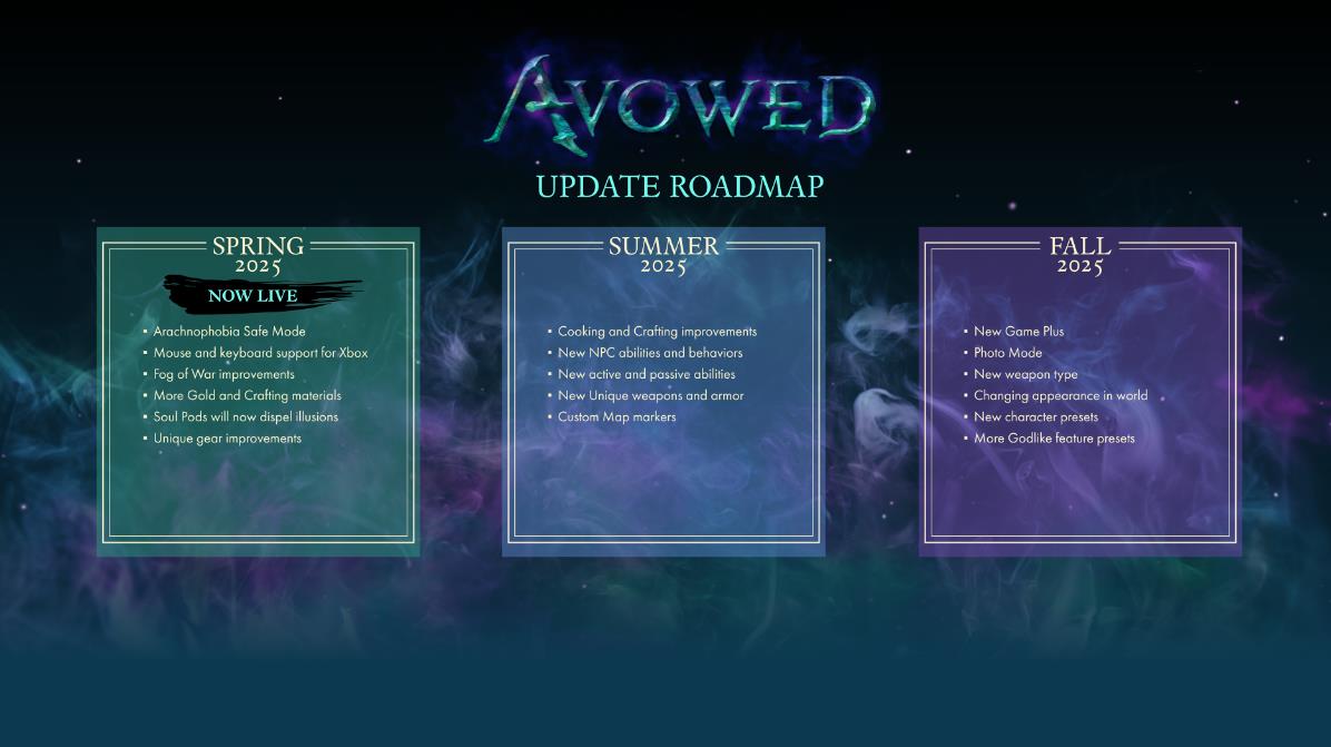 【黑曜石公开《宣誓》1.4版内容及后续更新计划】黑曜石现已为《宣誓》推送了1.4版本的更新。此次更新主要追加了“蜘蛛恐惧症模式”,并带来了一系列的修复和改进内容。此外,官方还公开了游戏的后续更新路线图。首先在夏季时,本作会迎来烹饪和制作的改进、全新的主动和被动技能、全新的武器和装备以及自定义地图标记;其次,秋季时会追加照片模式、新游戏+、新武器类型、改变外观和全新的角色预设等内容。《宣誓》已于今年2月在PC和Xbox Series平台上推出,首发Game Pass。