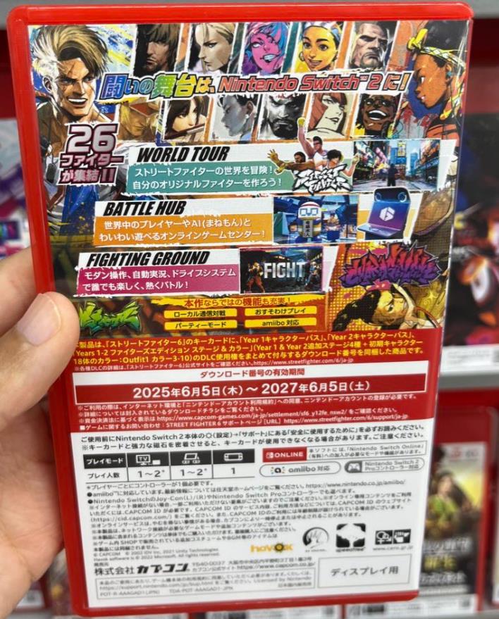 【NS2版《街霸6》采用钥匙卡+下载码设计】根据日本线下零售商所提供的NS2版《街头霸王6》外包装显示(由博主Genki分享),本作实体版为“钥匙卡”+“下载码”设计。游戏Year 1角色通行证、Year 2角色通行证、Year 1~2擂台&颜色等DLC内容将以下载码的方式附在其中。下载码兑换期间为2年,过期后无法使用。据任天堂商店页面显示,本作大小为48.8GB,支持中文。《街头霸王6:Years 1-2斗士版》将于6月5日登录NS2。