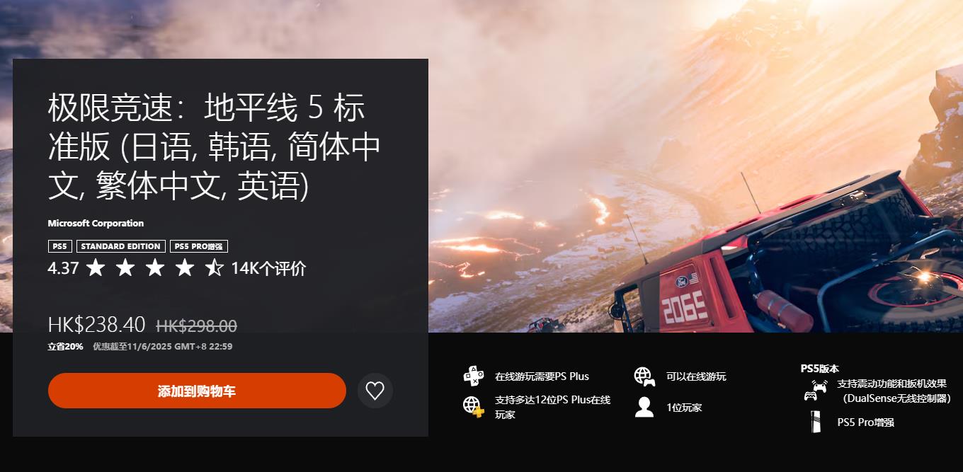 《极限竞速:地平线5》238.4 HKD(首次打折)