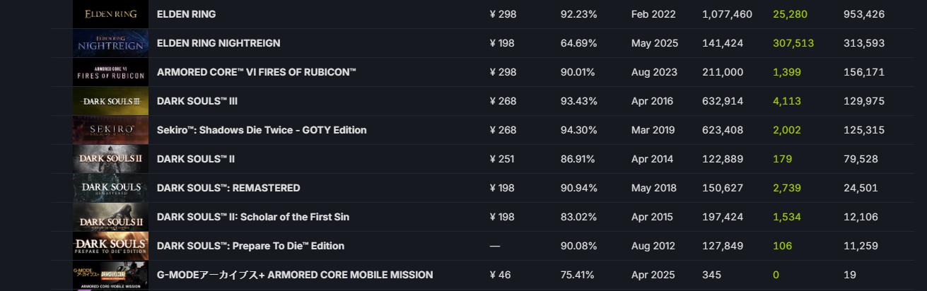 本作首日Steam上玩家在线游玩峰值数为313593,在FromSoftware所有作品中位居第二,第一仍被953426的《艾尔登法环》所占据。在PS商店中,游戏现阶段的评分为4.33(644个评价),其中五星好评率79%。《艾尔登法环:黑夜君临》现已在PS4/PS5/Xbox One/Xbox Series/PC上推出。