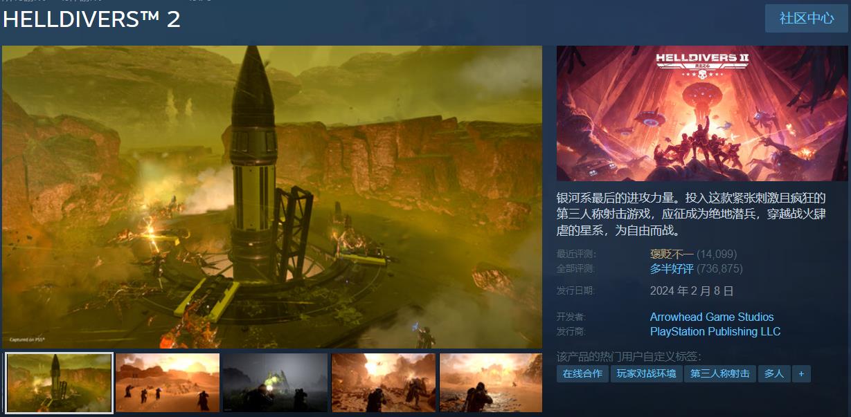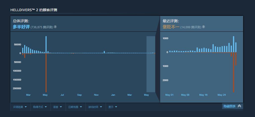 然而,这场战役的大捷并未让所有人皆大欢喜。期间仰齐浜的解放进度被锁定在99.9783%,引起了众多粉丝的强烈不满。因此自前天起,游戏在Steam上收到了诸多差评。导致《绝地潜兵2》在该平台上的最近评价转为“褒贬不一”。