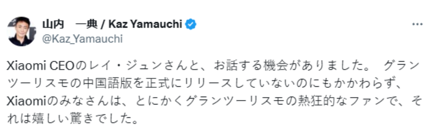 【《GT赛车》制作人山内一典与小米CEO雷军见面】近日,《GT赛车》制作人在个人社交媒体上发文称:我已经与雷军先生会面,小米团队展现出了对该系列"惊人的热情"。山内对此表示,自己倍感惊喜,并分享了两人的合照。