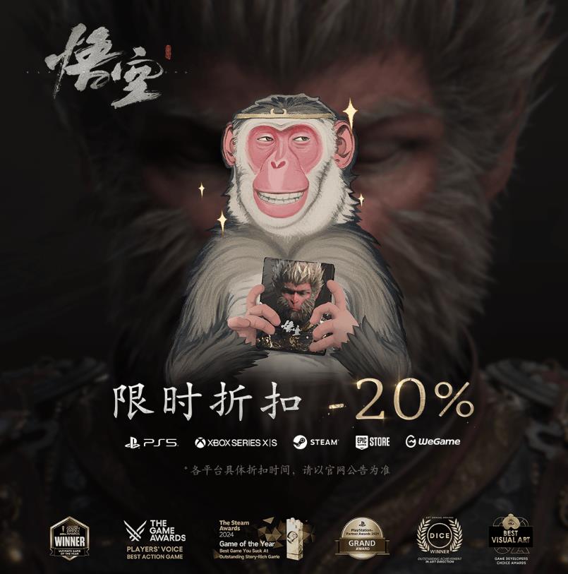 最后,《黑神话:悟空》数字版即将开启第一次全平台打折(全部八折)活动。