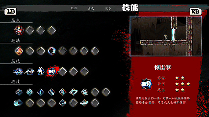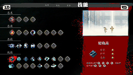 战技是基础攻击的延伸,包括轻攻击、重攻击、飞踢、手里剑投掷、空中回旋斩、范围攻击型“忍杀”等,共计17种。这些技能组成了你日常战斗的主旋律。