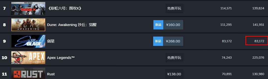 虽然《剑星》发售仅有几个小时,但游戏现在Steam上的同时在线玩家峰值数已达83172。该数字已经超过了《对马之魂》《战神》《蜘蛛侠》《地平线》等大部分PlayStation在该平台上发行的单机游戏,仅落后服务型游戏《绝地潜兵2》。目前本作的峰值数仍在持续增长中。